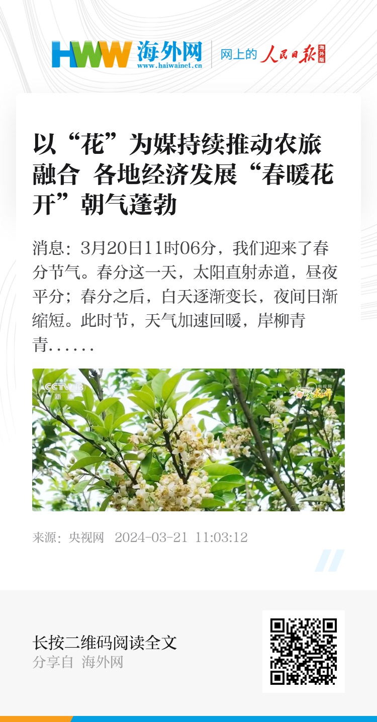 央视网消息:3月20日11时06分,我们迎来了春分节气。春分这一天,太阳直射赤道,昼夜平分;春分之后,白天逐渐变长,夜间日渐缩短。此时节,天气加速回暖,岸柳青青、莺飞草长、桃红李白迎春黄。下面我们就跟随镜头,一起去各地感受美好的春暖花开。