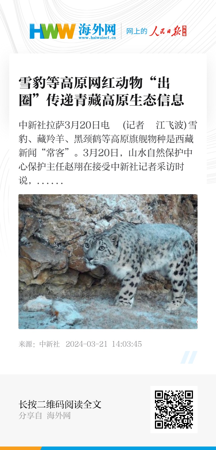 中新社拉萨3月20日电 (记者 江飞波)雪豹、藏羚羊、黑颈鹤等高原旗舰物种是西藏新闻“常客”。3月20日,山水自然保护中心保护主任赵翔在接受中新社记者采访时说,高原“网红动物”在互联网、短视频等平台的曝光度不断增加,直观地向受众传递了青藏高原生态得到很好保护的信息,也建立了一种公众与物种之间的连接。