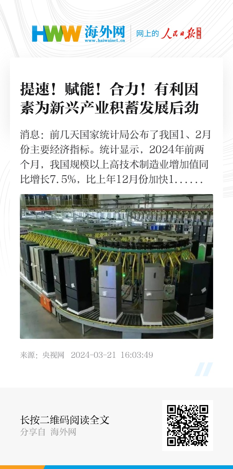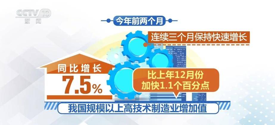 央视网消息:前几天国家统计局公布了我国1、2月份主要经济指标。统计显示,2024年前两个月,我国规模以上高技术制造业增加值同比增长7.5%,比上年12月份加快1.1个百分点,连续三个月保持快速增长。