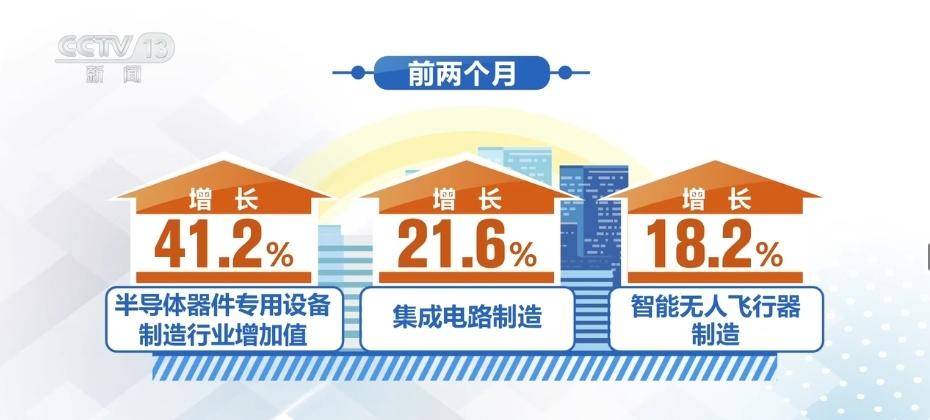 数据显示,2024年以来,具有高科技、高效能、高质量特征的行业发展向好。前两个月,半导体器件专用设备制造行业增加值增长41.2%,集成电路制造增长21.6%,智能无人飞行器制造增长18.2%。
