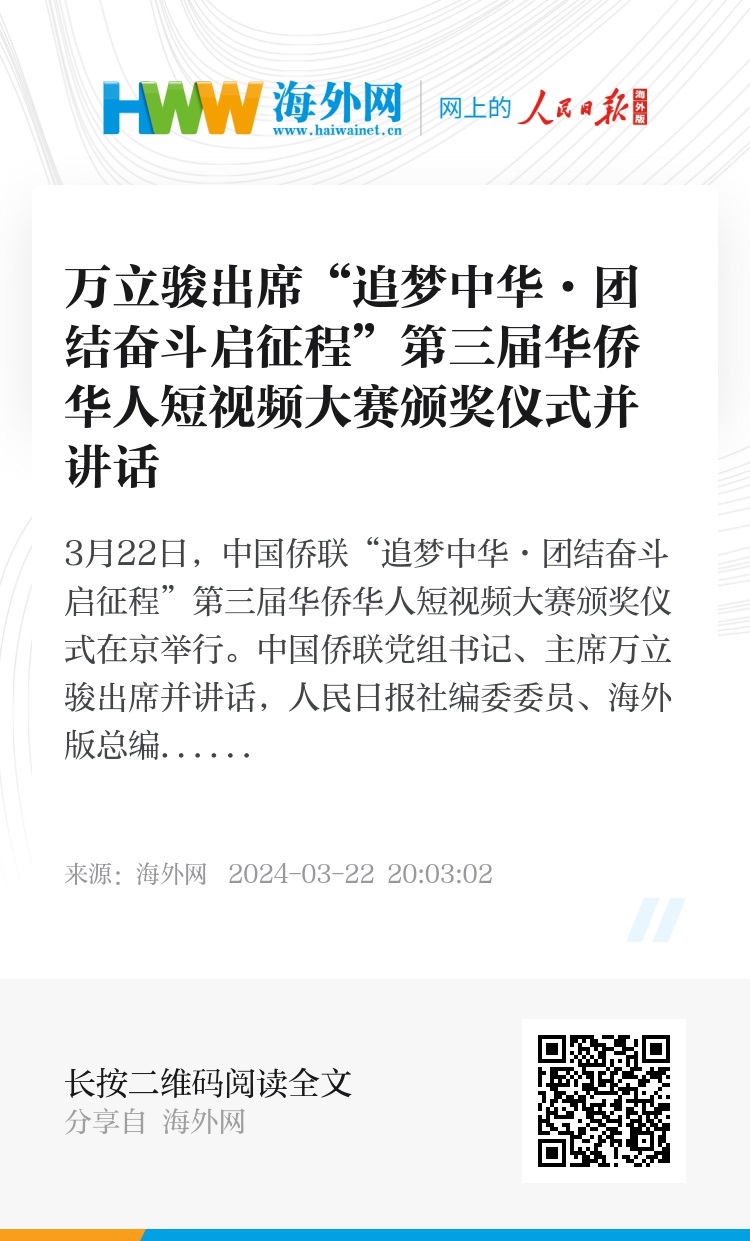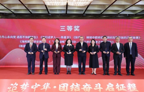 3月22日,中国侨联“追梦中华·团结奋斗启征程”第三届华侨华人短视频大赛颁奖仪式在京举行。中国侨联党组书记、主席万立骏出席并讲话,人民日报社编委委员、海外版总编辑陈贽出席并致辞。中国侨联党组成员、副主席程学源,中国侨联兼职副主席郭占力,人民日报海外网总经理徐蕾等出席颁奖仪式并为获奖单位颁奖。中科院院士、中国科学院杭州医学研究所所长谭蔚泓,中国侨商联合会监事长、德迈国际产业集团董事长施乾平以及有关省级侨联负责同志、获奖代表等参加颁奖仪式。