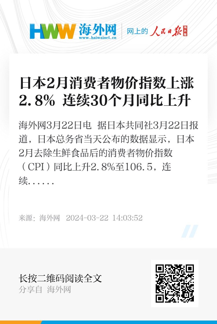 海外网3月22日电 据日本共同社3月22日报道,日本总务省当天公布的数据显示,日本2月去除生鲜食品后的消费者物价指数(CPI)同比上升2.8%至106.5,连续30个月同比上升。