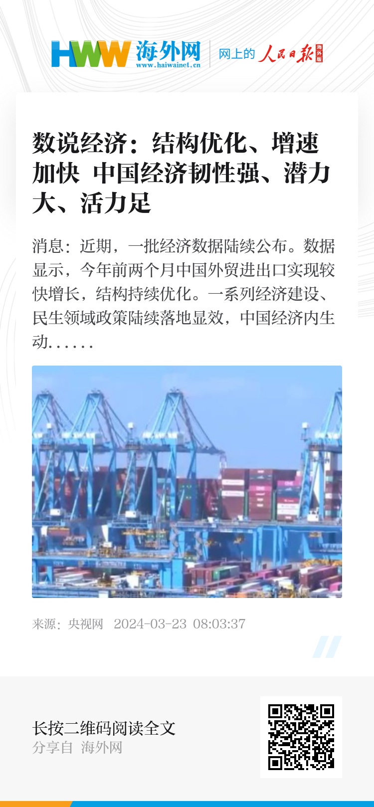 央视网消息:近期,一批经济数据陆续公布。数据显示,今年前两个月中国外贸进出口实现较快增长,结构持续优化。一系列经济建设、民生领域政策陆续落地显效,中国经济内生动力不断积蓄。