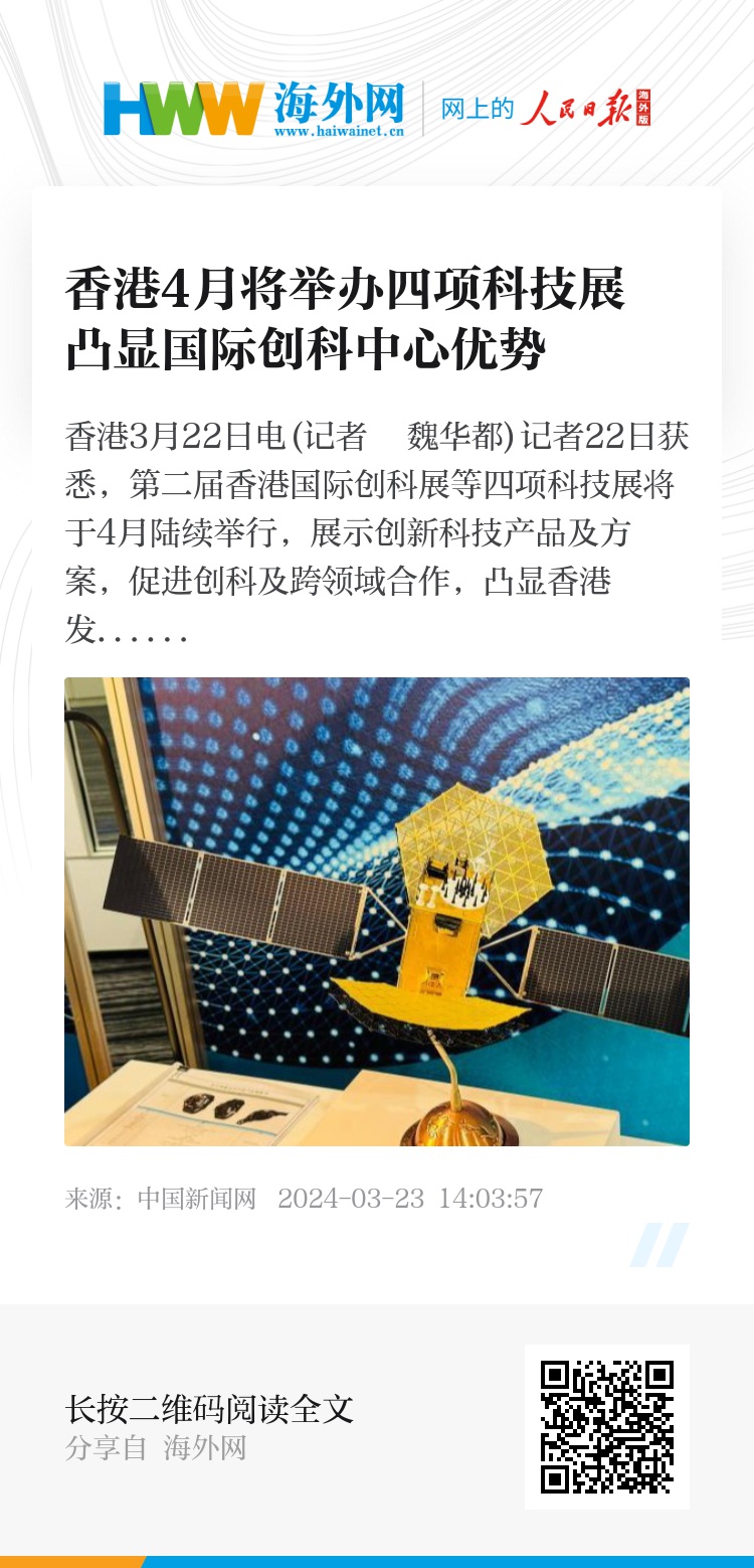 中新网香港3月22日电(记者 魏华都)记者22日获悉,第二届香港国际创科展等四项科技展将于4月陆续举行,展示创新科技产品及方案,促进创科及跨领域合作,凸显香港发展成为国际创新科技中心的优势。