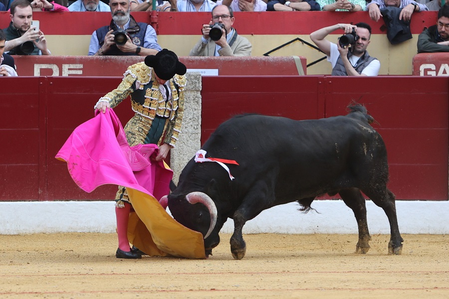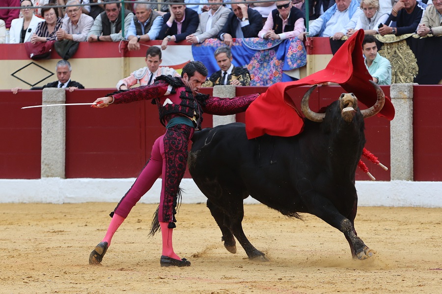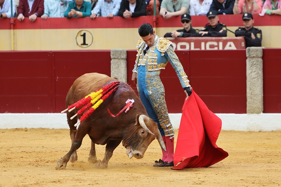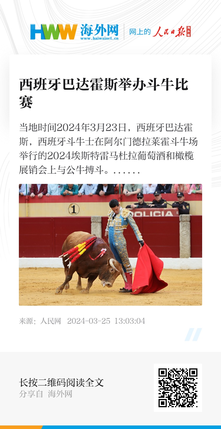当地时间2024年3月23日,西班牙巴达霍斯,西班牙斗牛士在阿尔门德拉莱霍斗牛场举行的2024埃斯特雷马杜拉葡萄酒和橄榄展销会上与公牛搏斗。