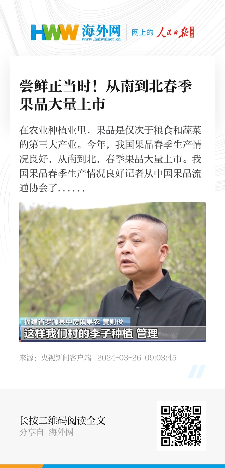 在农业种植业里,果品是仅次于粮食和蔬菜的第三大产业。今年,我国果品春季生产情况良好,从南到北,春季果品大量上市。