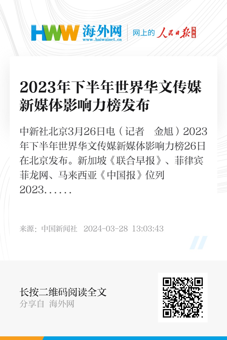 新加坡《联合早报》、菲律宾菲龙网、马来西亚《中国报》位列2023年下半年世界华文传媒新媒体影响力海外地区总榜前三。中国香港凤凰卫视、中国台湾ETtoday新闻云、中国香港无线电视位列2023年下半年世界华文传媒新媒体影响力港澳台地区总榜前三。