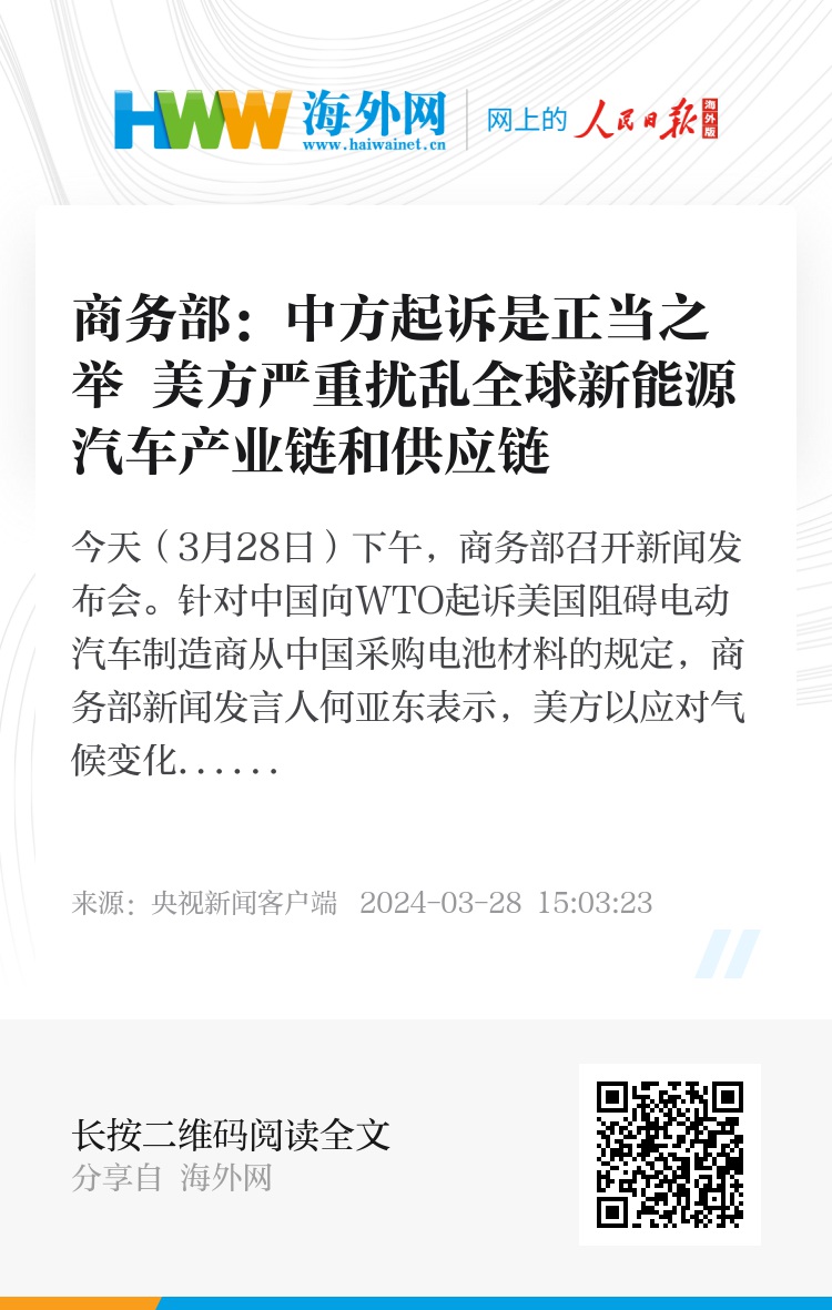 今天(3月28日)下午,商务部召开新闻发布会。针对中国向WTO起诉美国阻碍电动汽车制造商从中国采购电池材料的规定,商务部新闻发言人何亚东表示,美方以应对气候变化低碳环境为名,出台《通胀消减法》及其实施细则,以使用美国等特定地区产品作为补贴前提,制订出台歧视性的补贴政策,这扭曲了公平竞争,严重扰乱了全球新能源汽车产业链和供应链,违反了相关世贸规则,中方起诉既是维护中方新能源汽车企业利益和全球新能源汽车产业公平竞争环境的正当之举,也是为了坚定捍卫以规则为基础的多边贸易体制,坚决维护新能源汽车全球产业链和供应链稳定。