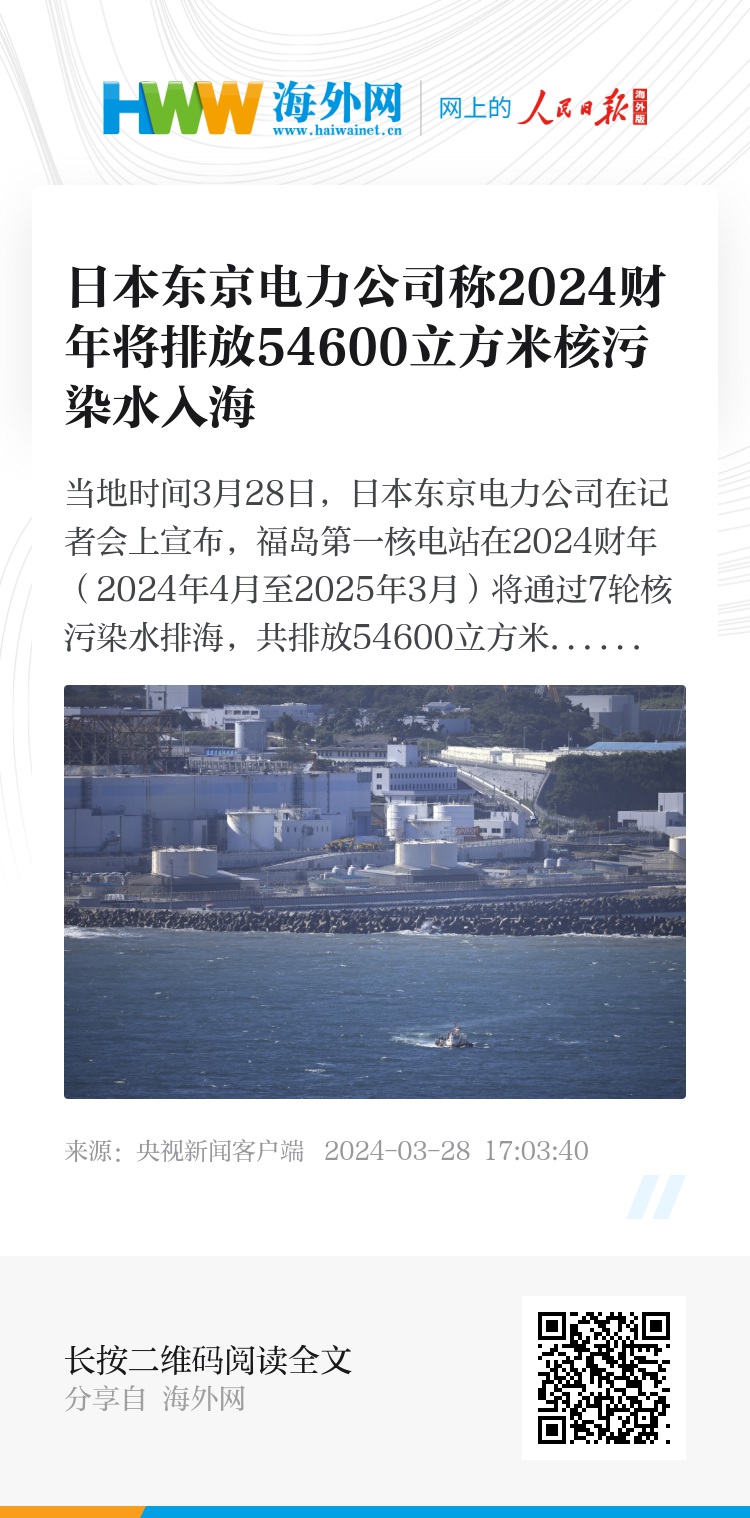 当地时间3月28日,日本东京电力公司在记者会上宣布,福岛第一核电站在2024财年(2024年4月至2025年3月)将通过7轮核污染水排海,共排放54600立方米核污染水,放射量总计14万亿贝克勒尔。