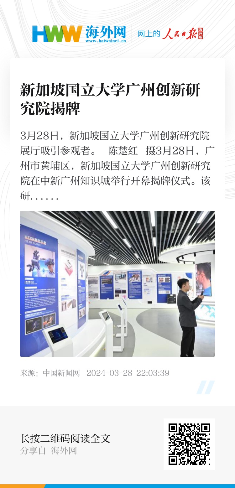据介绍,新加坡国立大学广州创新研究院将着力打造教学研创企深度融合新典范,致力于在人才培养、科研攻关、创新孵化、成果转化等方面取得更多标志性成果。