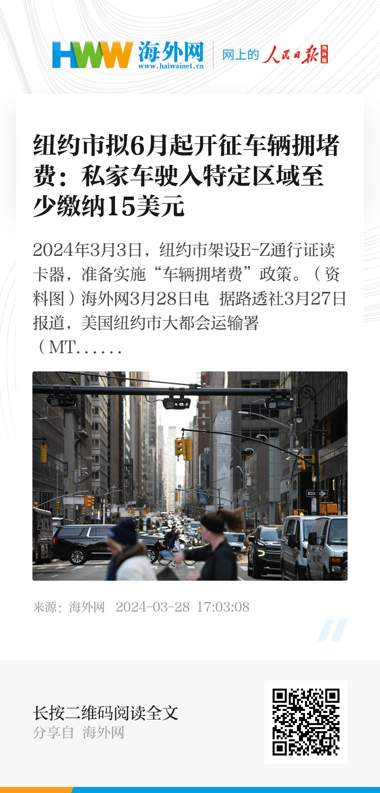 海外网3月28日电 据路透社3月27日报道,美国纽约市大都会运输署(MTA)董事会当天批准征收车辆拥堵费,为全美首例。纽约市预计于今年6月起对驶入曼哈顿60街以南区域的车辆征收费用,私家车辆需至少缴纳15美元(约合人民币108.4元)。
