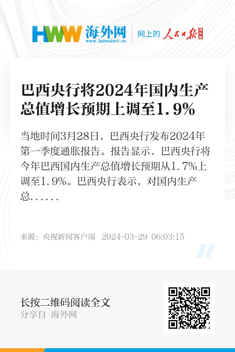 当地时间3月28日,巴西央行发布2024年第一季度通胀报告。报告显示,巴西央行将今年巴西国内生产总值增长预期从1.7%上调至1.9%。巴西央行表示,对国内生产总值增长预期的调整反映出该国年初经济活力表现略高于先前的预测水平。