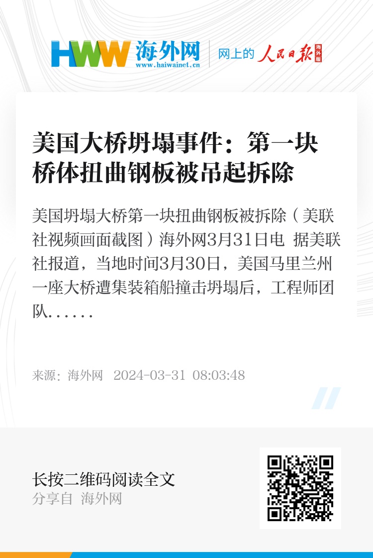 海外网3月31日电 据美联社报道,当地时间3月30日,美国马里兰州一座大桥遭集装箱船撞击坍塌后,工程师团队开始从坍塌的大桥上切割并吊起第一块扭曲的钢板。