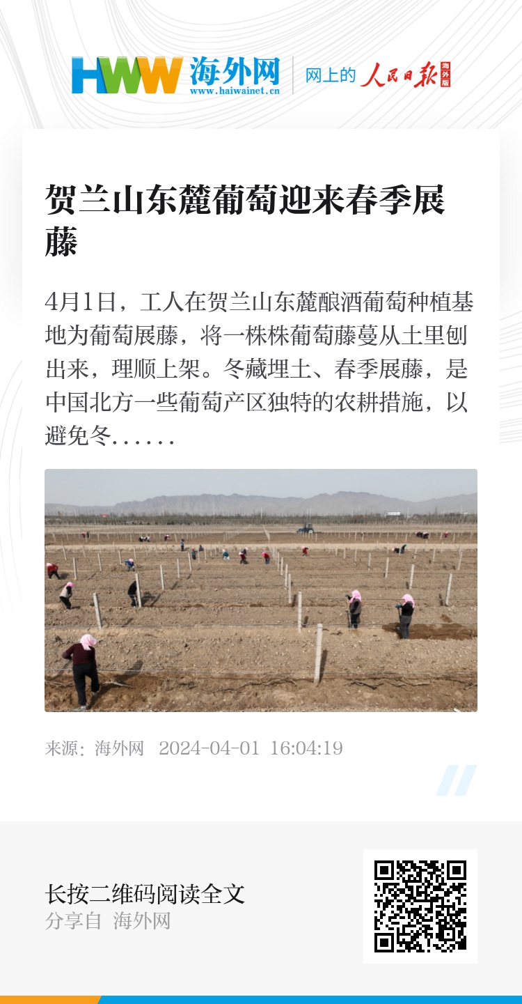4月1日,工人在贺兰山东麓酿酒葡萄种植基地为葡萄展藤,将一株株葡萄藤蔓从土里刨出来,理顺上架。冬藏埋土、春季展藤,是中国北方一些葡萄产区独特的农耕措施,以避免冬季低温冻伤葡萄藤。 图源:视觉中国