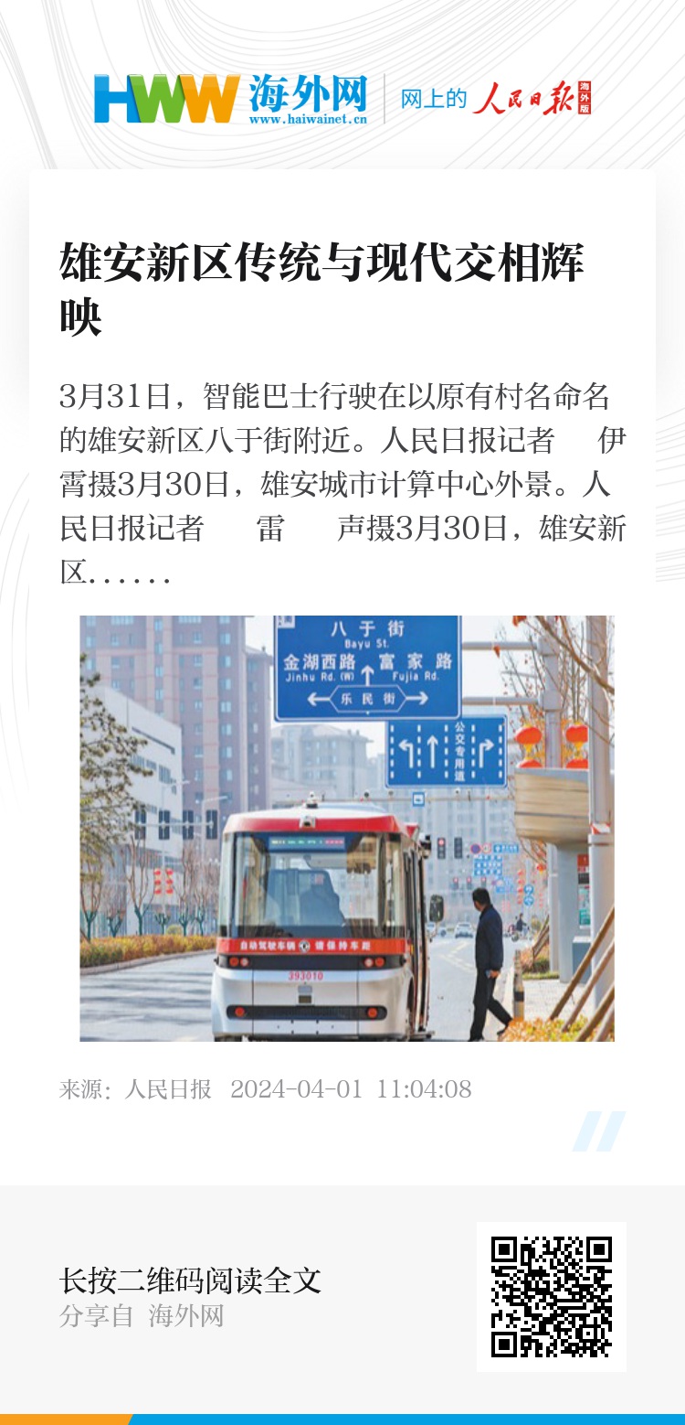 3月31日,智能巴士行驶在以原有村名命名的雄安新区八于街附近。