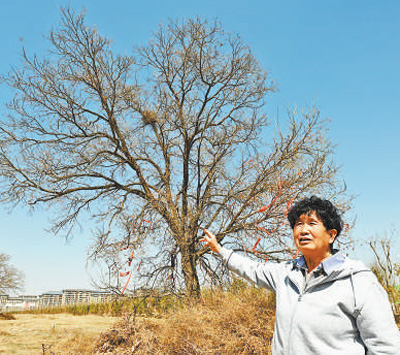3月30日,雄安新区容西片区段庄村村民商杏兰在介绍自家院子原址上的老槐树。
