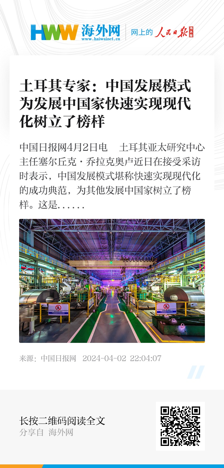 乔拉克奥卢说:“在这方面,中国发展模式堪称快速实现现代化的又一个成功典范。”