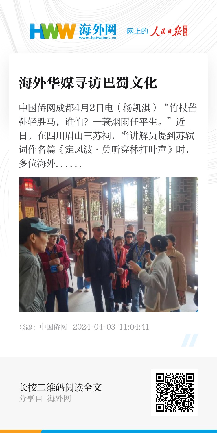 中国侨网成都4月2日电(杨凯淇)“竹杖芒鞋轻胜马,谁怕?一蓑烟雨任平生。”近日,在四川眉山三苏祠,当讲解员提到苏轼词作名篇《定风波·莫听穿林打叶声》时,多位海外华文媒体人自发深情吟诵,致敬这份流传千古的旷达之意。