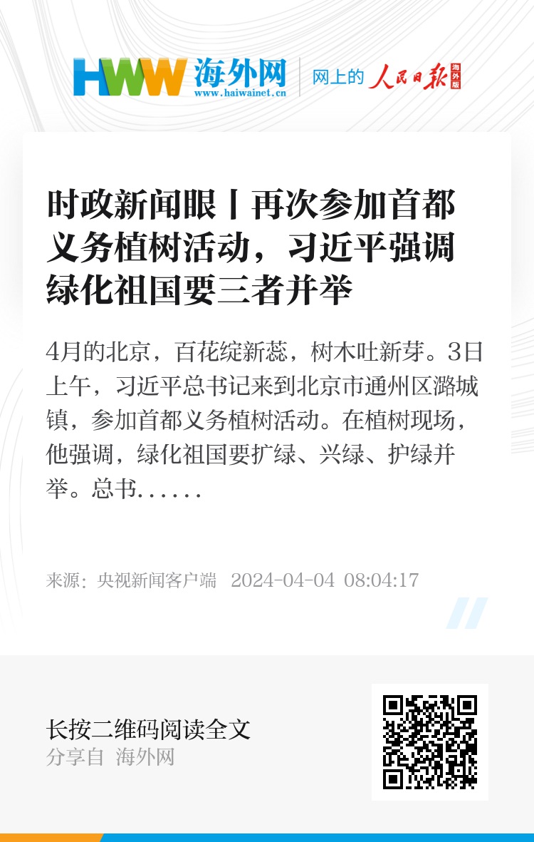 4月的北京,百花绽新蕊,树木吐新芽。3日上午,习近平总书记来到北京市通州区潞城镇,参加首都义务植树活动。在植树现场,他强调,绿化祖国要扩绿、兴绿、护绿并举。