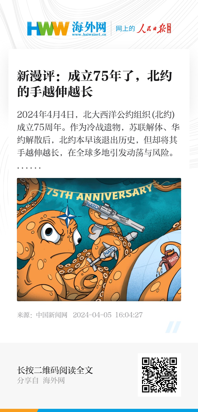 2024年4月4日,北大西洋公约组织(北约)成立75周年。作为冷战遗物,苏联解体、华约解散后,北约本早该退出历史,但却将其手越伸越长,在全球多地引发动荡与风险。
