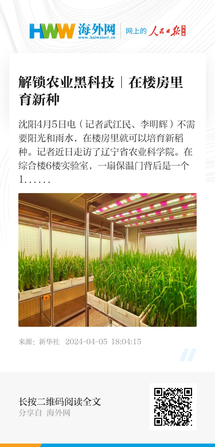 新华社沈阳4月5日电(记者武江民、李明辉)不需要阳光和雨水,在楼房里就可以培育新稻种。记者近日走访了辽宁省农业科学院。在综合楼6楼实验室,一扇保温门背后是一个12平方米的水稻育种工厂,这里的水稻生长没有四季之分,稻子从播种到收获只需100天左右,比东北地区常规大田的种植周期缩短了近三分之一。
