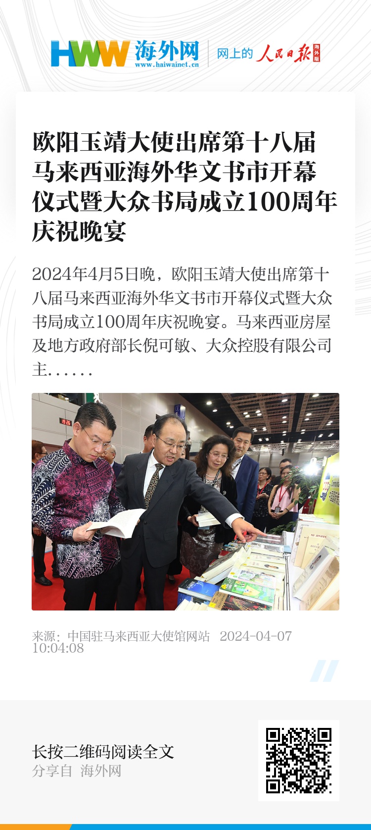 2024年4月5日晚,欧阳玉靖大使出席第十八届马来西亚海外华文书市开幕仪式暨大众书局成立100周年庆祝晚宴。马来西亚房屋及地方政府部长倪可敏、大众控股有限公司主席姚志胜等出席活动。