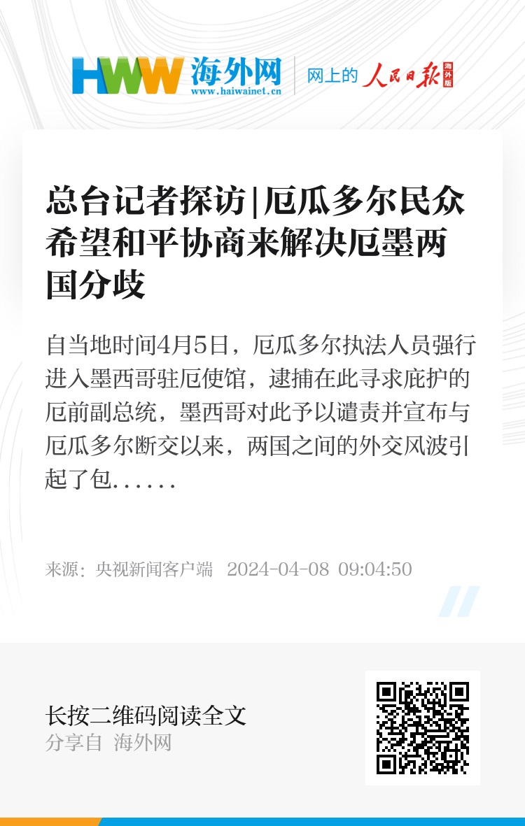自当地时间4月5日,厄瓜多尔执法人员强行进入墨西哥驻厄使馆,逮捕在此寻求庇护的厄前副总统,墨西哥对此予以谴责并宣布与厄瓜多尔断交以来,两国之间的外交风波引起了包括拉美地区的国际社会的普遍关注。
