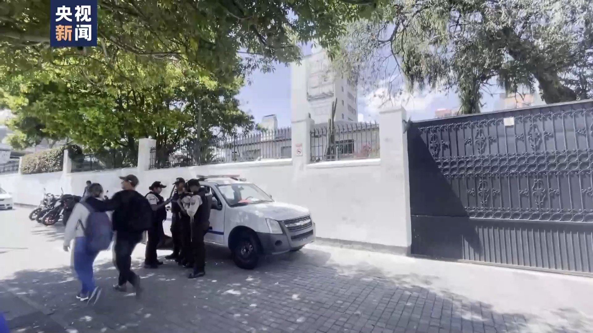 总台记者 雷湘平:我现在正在墨西哥驻厄瓜多尔大使馆门口。自从5日墨西哥宣布跟厄瓜多尔断交以来,我身后使馆的大门已经是紧闭,馆内旗杆上的墨西哥国旗已经被撤下。现在在使馆的外围停了三四辆当地的警车,以用于维持当地的秩序。