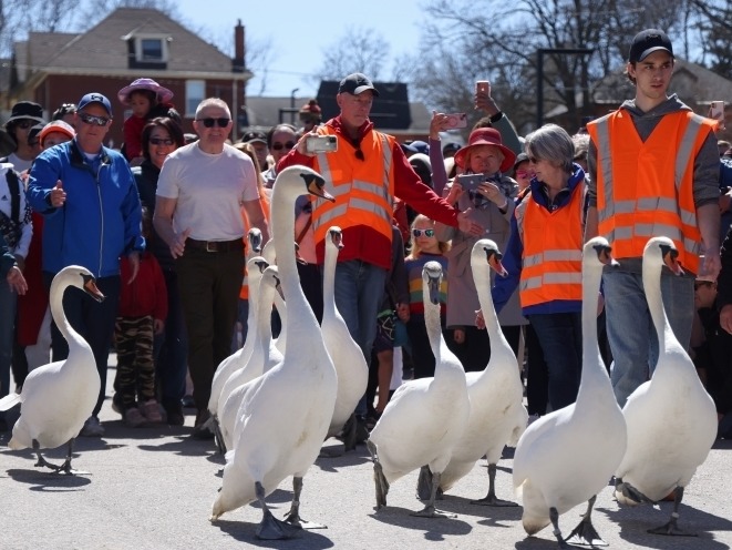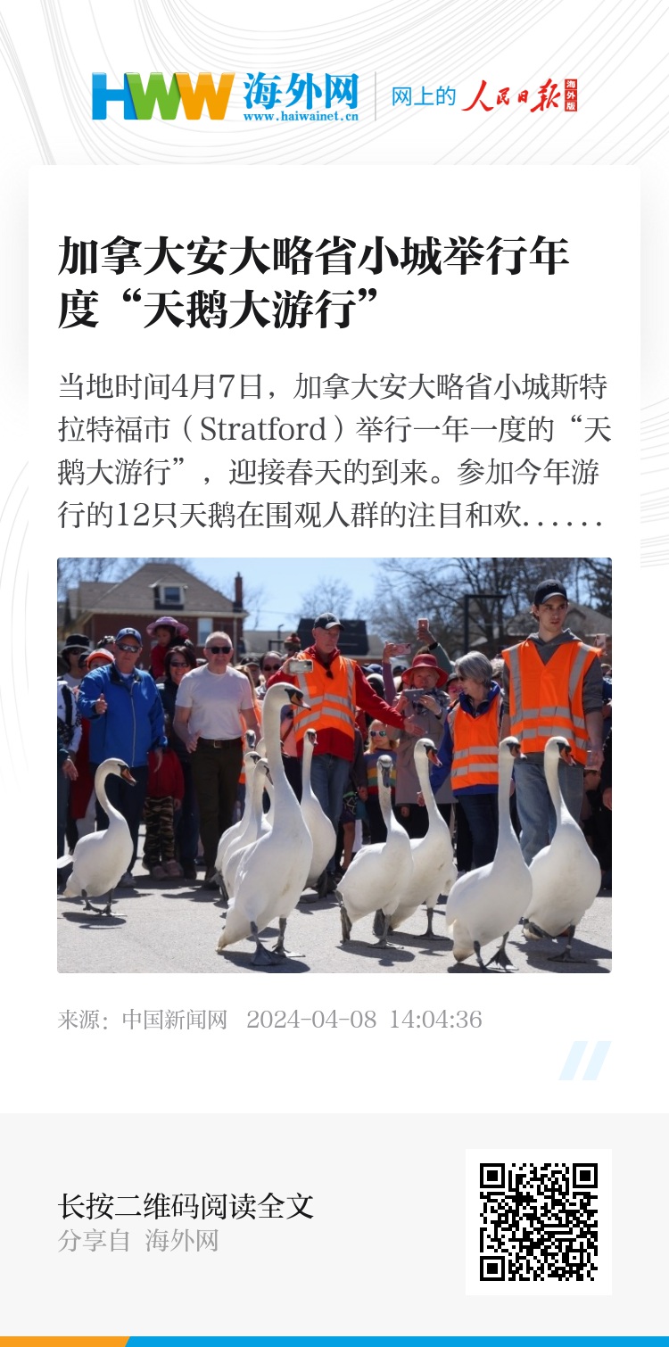 当地时间4月7日,加拿大安大略省小城斯特拉特福市(Stratford)举行一年一度的“天鹅大游行”,迎接春天的到来。参加今年游行的12只天鹅在围观人群的注目和欢呼中穿过街道,最后游入当地的埃文河。这项已持续逾30年的活动如今已成为当地每年初春吸引游客的保留节目。