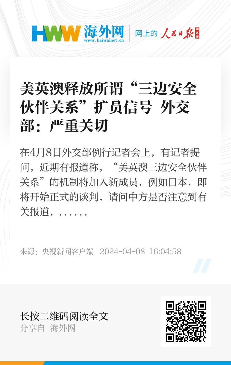 在4月8日外交部例行记者会上,有记者提问,近期有报道称,“美英澳三边安全伙伴关系”的机制将加入新成员,例如日本,即将开始正式的谈判,请问中方是否注意到有关报道,能否对此进行回应?