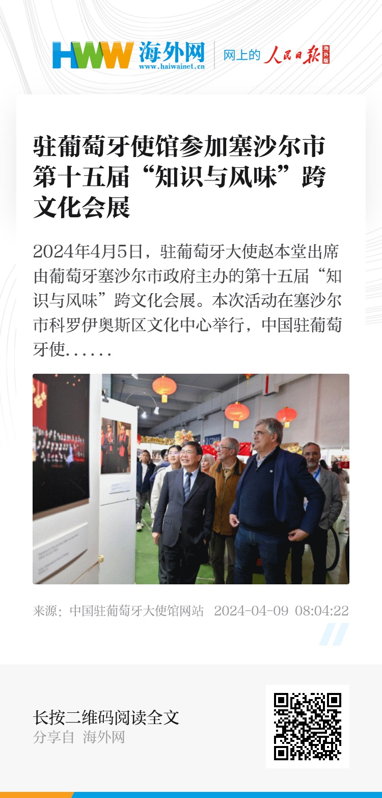 2024年4月5日,驻葡萄牙大使赵本堂出席由葡萄牙塞沙尔市政府主办的第十五届“知识与风味”跨文化会展。本次活动在塞沙尔市科罗伊奥斯区文化中心举行,中国驻葡萄牙使馆应邀参加。