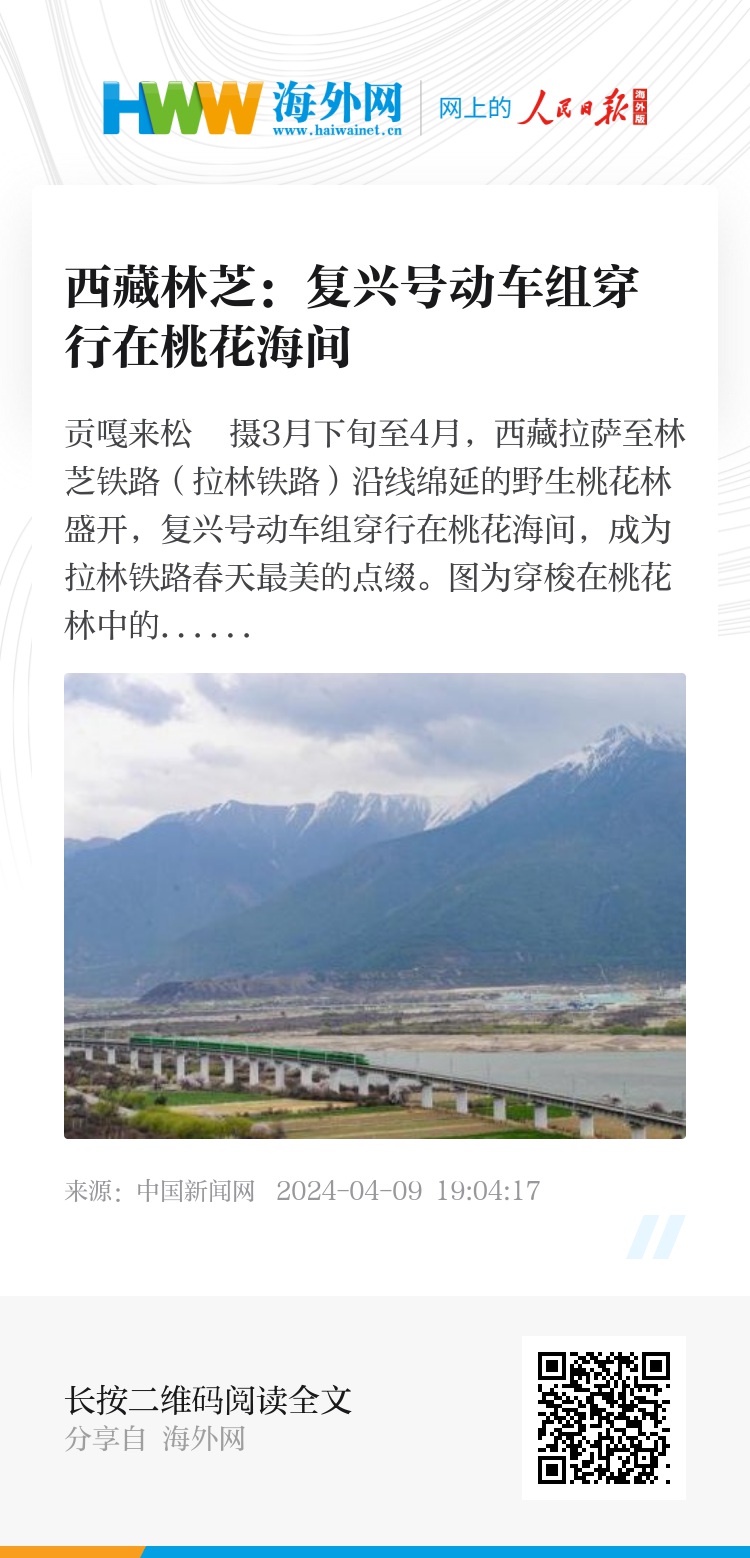 据悉,拉林铁路是一条连接西藏拉萨市与林芝市的国铁Ⅰ级单线电气化铁路,全长435公里,设计时速160公里,于2021年6月25日开通运营。图为穿梭在桃花林中的拉林铁路高原复兴号。