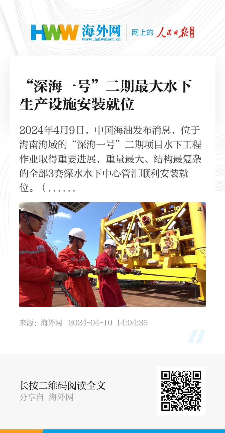2024年4月9日,中国海油发布消息,位于海南海域的“深海一号”二期项目水下工程作业取得重要进展,重量最大、结构最复杂的全部3套深水水下中心管汇顺利安装就位。(图源:视觉中国)