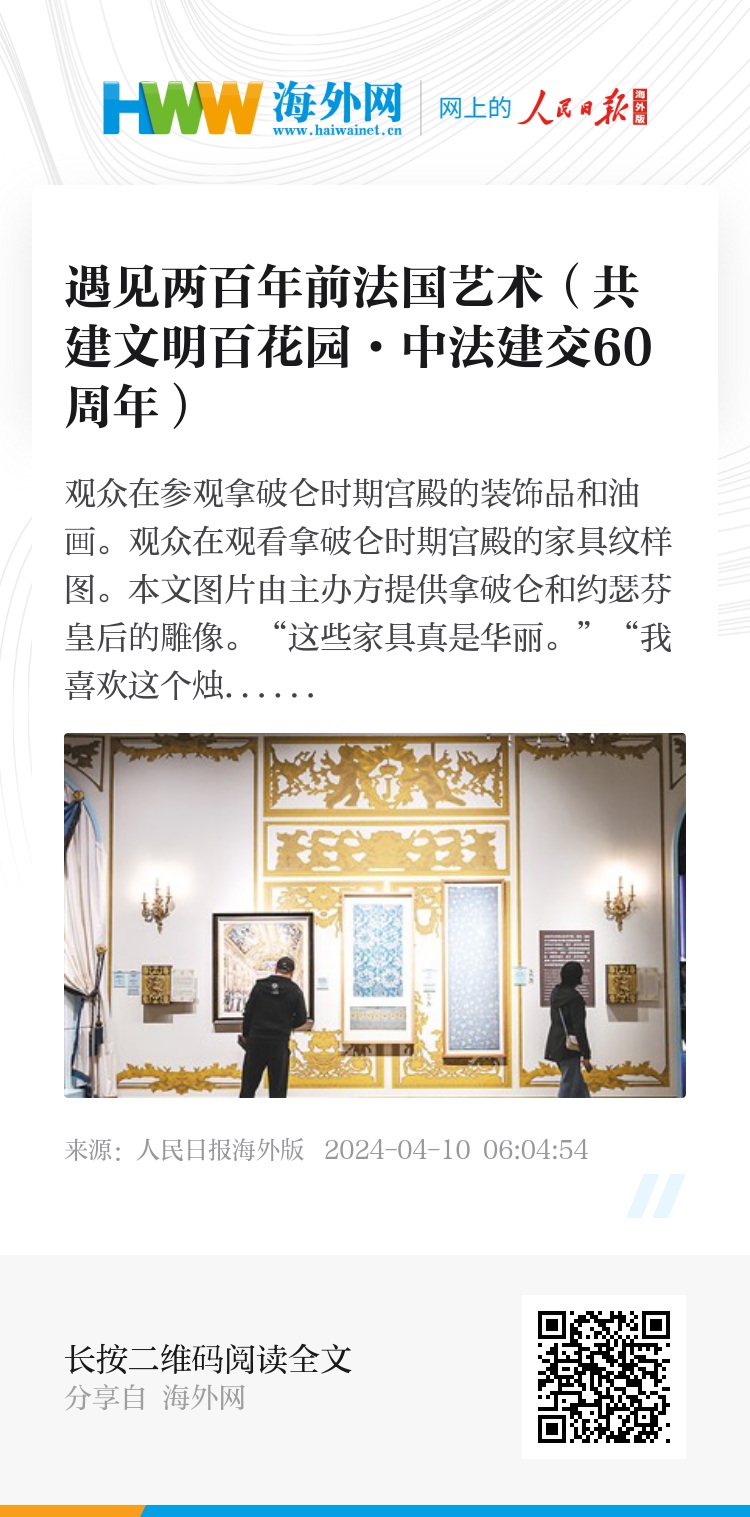 “这些家具真是华丽。”“我喜欢这个烛台,特别有雕塑的美感。”“能够一口气欣赏到这么多珍贵的法国文物,真是太值了。”……日前,“遇见拿破仑:消失的宫殿”展览在遇见博物馆·北京798馆亮相,不少观众专程前来感受浓郁的法国风情。作为2024年庆祝中法建交60周年暨中法文化旅游年重点项目之一,该展览以81件(套)拿破仑时期珍贵文物展现法国文化魅力和拿破仑的传奇一生,加深两国之间的友谊与文化交流。