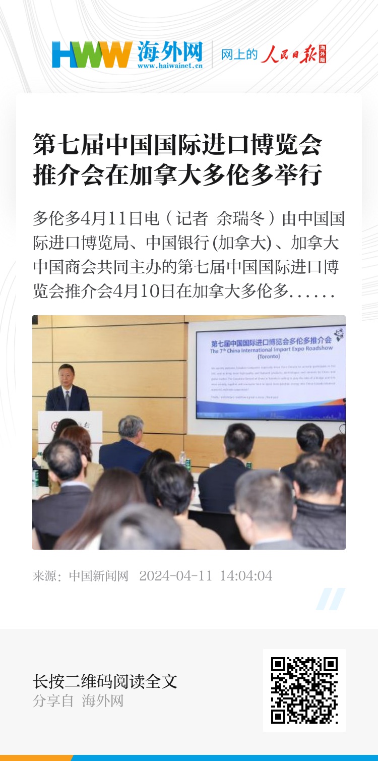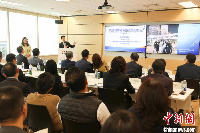 中新网多伦多4月11日电(记者 余瑞冬)由中国国际进口博览局、中国银行(加拿大)、加拿大中国商会共同主办的第七届中国国际进口博览会推介会4月10日在加拿大多伦多举行。