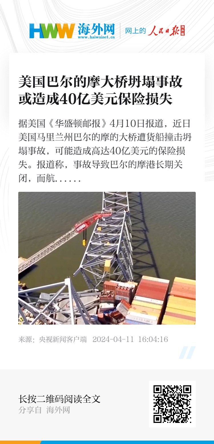 据美国《华盛顿邮报》4月10日报道,近日美国马里兰州巴尔的摩的大桥遭货船撞击坍塌事故,可能造成高达40亿美元的保险损失。