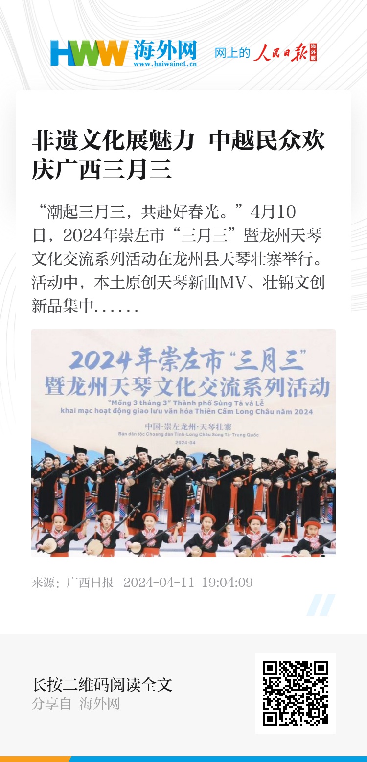 “潮起三月三,共赴好春光。”4月10日,2024年崇左市“三月三”暨龙州天琴文化交流系列活动在龙州县天琴壮寨举行。活动中,本土原创天琴新曲MV、壮锦文创新品集中“亮相”,还有精彩的中越文艺表演、东盟十国青年水坝走秀、水上疍家婚礼、水上中越服饰走秀表演等丰富多彩的民俗文化活动,让中越两国嘉宾、边民、游客感受到中华民族传统文化和东盟国家文化魅力。