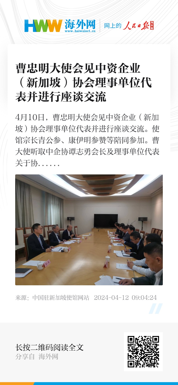 4月10日,曹忠明大使会见中资企业(新加坡)协会理事单位代表并进行座谈交流。使馆宗长青公参、康伊明参赞等陪同参加。