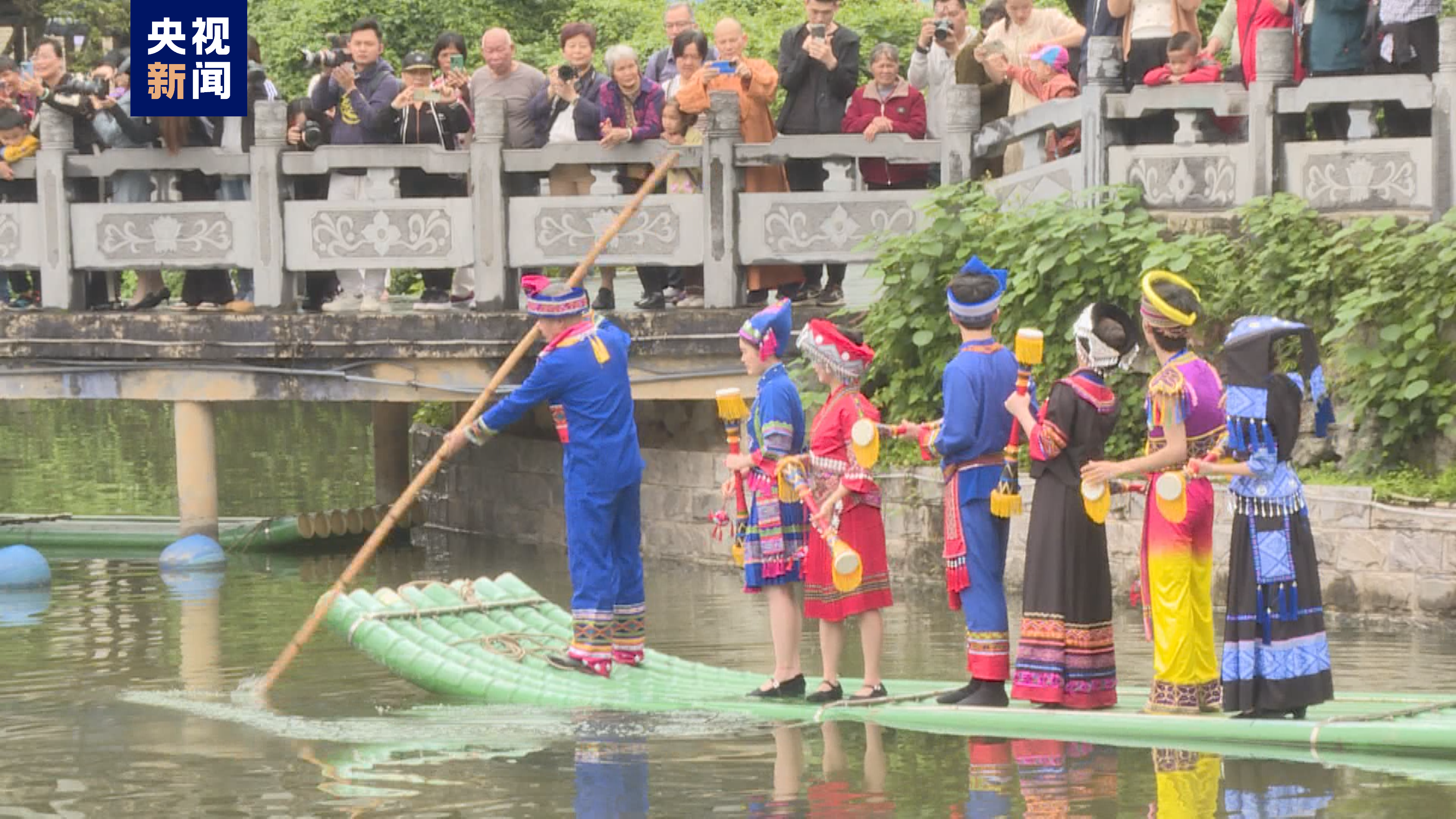 阿哥阿妹们乘坐竹筏与岸边的游客山歌对唱,以歌会友,表达节日祝福。在湖中心舞台上,随着美妙的音乐响起,壮族阿哥阿妹们的优美舞姿吸引着游客们的目光,游客们也被这浓厚的民族氛围所感染,共同感受广西三月三特色文化的魅力。