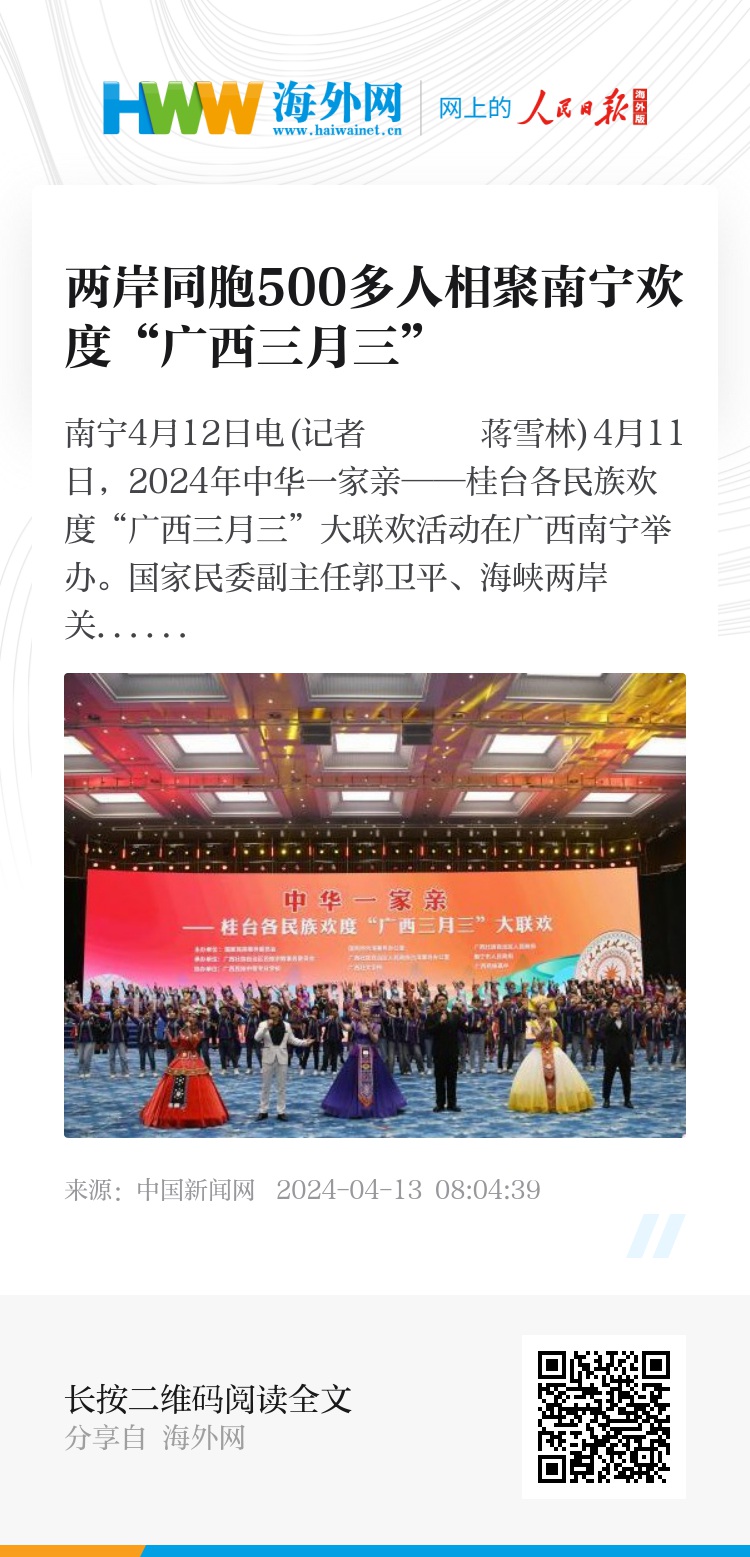 据悉,本次活动由国家民族事务委员会、国务院台湾事务办公室和广西壮族自治区人民政府共同主办。中华一家亲——桂台各民族欢度“广西三月三”大联欢活动已成功举办8届,成为桂台各民族交流交往交融的重要平台。
