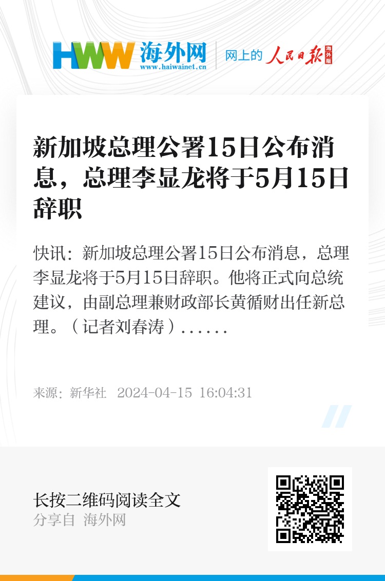 新华社快讯:新加坡总理公署15日公布消息,总理李显龙将于5月15日辞职。他将正式向总统建议,由副总理兼财政部长黄循财出任新总理。(记者刘春涛)