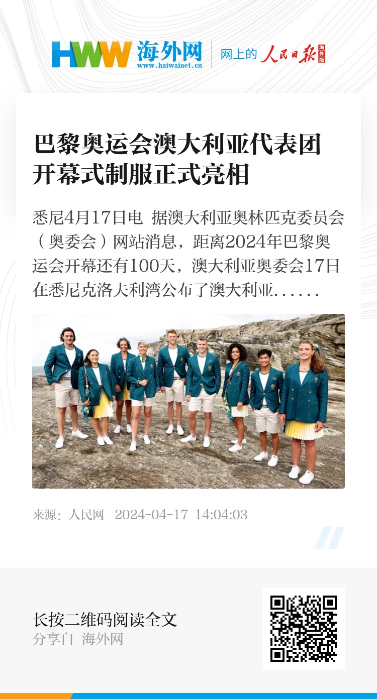人民网悉尼4月17日电 据澳大利亚奥林匹克委员会(奥委会)网站消息,距离2024年巴黎奥运会开幕还有100天,澳大利亚奥委会17日在悉尼克洛夫利湾公布了澳大利亚代表团在巴黎奥运会开幕式上的着装样式。