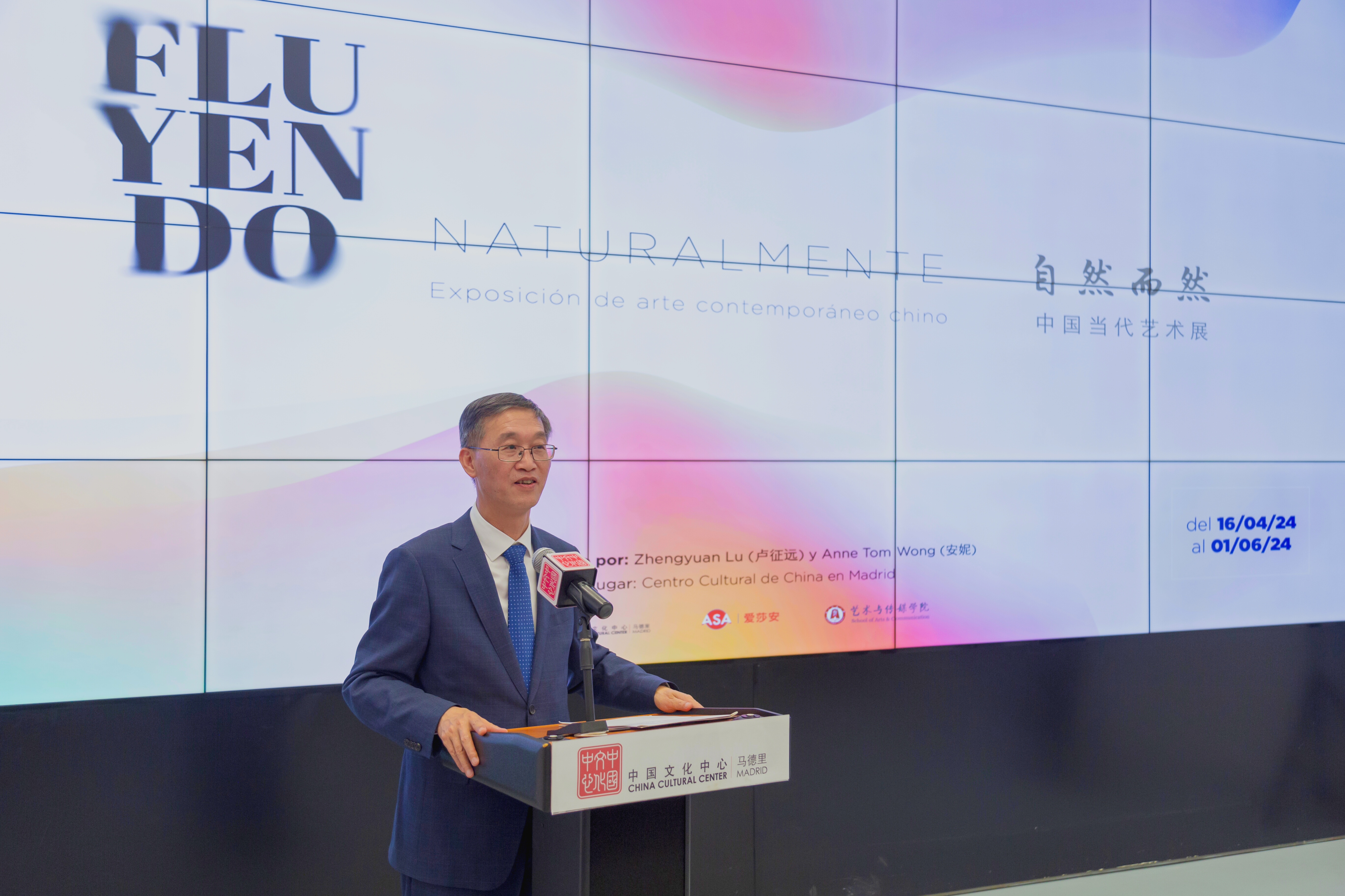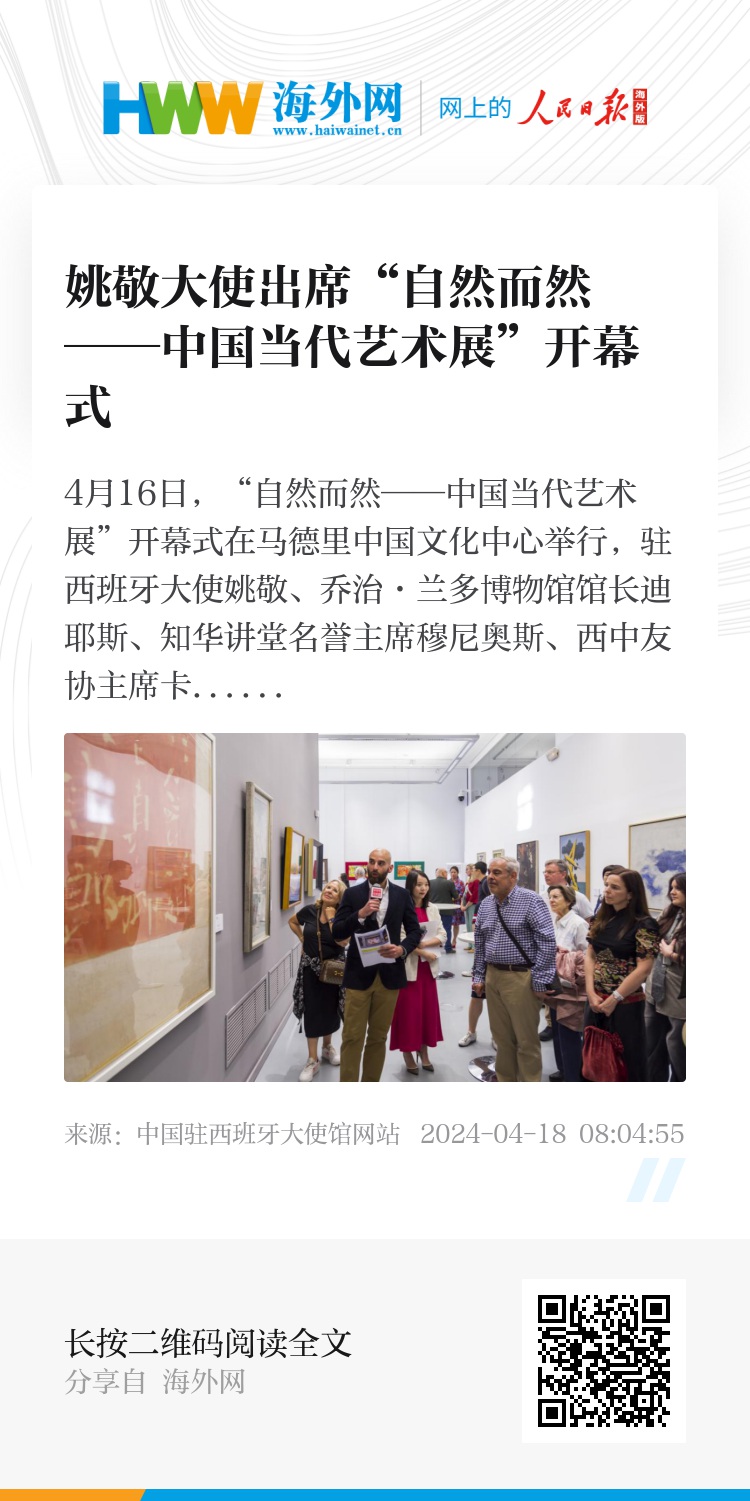 4月16日,“自然而然——中国当代艺术展”开幕式在马德里中国文化中心举行,驻西班牙大使姚敬、乔治·兰多博物馆馆长迪耶斯、知华讲堂名誉主席穆尼奥斯、西中友协主席卡莫纳、北京师范大学艺术与传媒学院教授甄巍以及当地文化艺术和新闻界嘉宾近80人参加活动。