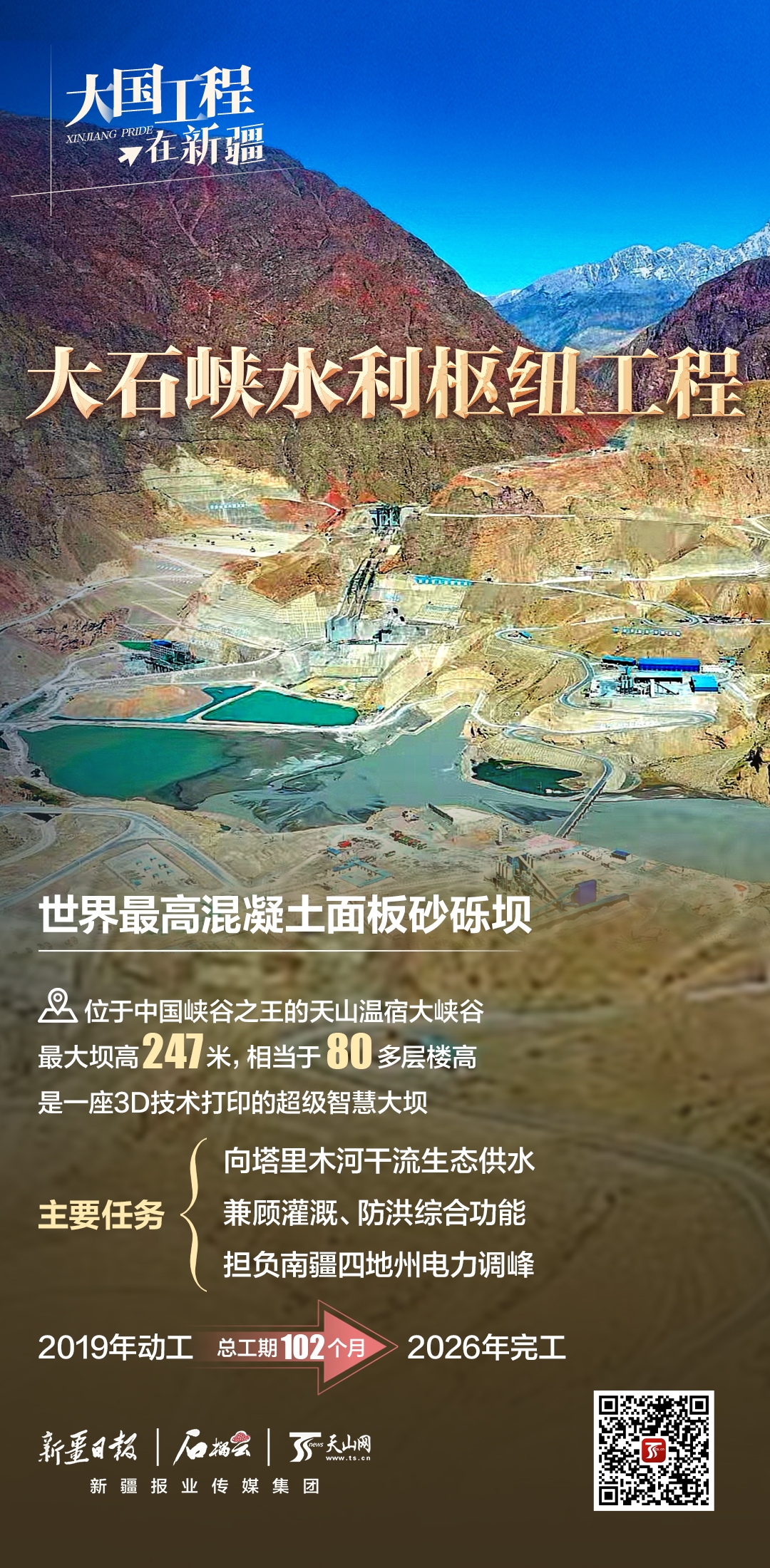 新疆大石峡水利枢纽工程建在号称中国峡谷之王的天山温宿大峡谷之中,拦河坝主坝为混凝土面板砂砾石坝,最大坝高247米,坝顶长度606米,比三峡大坝还高62米,是当之无愧的天堑工程。