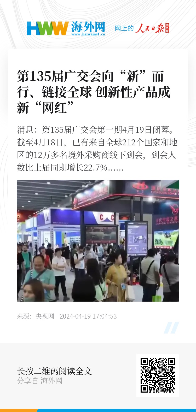 央视网消息:第135届广交会第一期4月19日闭幕。截至4月18日,已有来自全球212个国家和地区的12万多名境外采购商线下到会,到会人数比上届同期增长22.7%。
