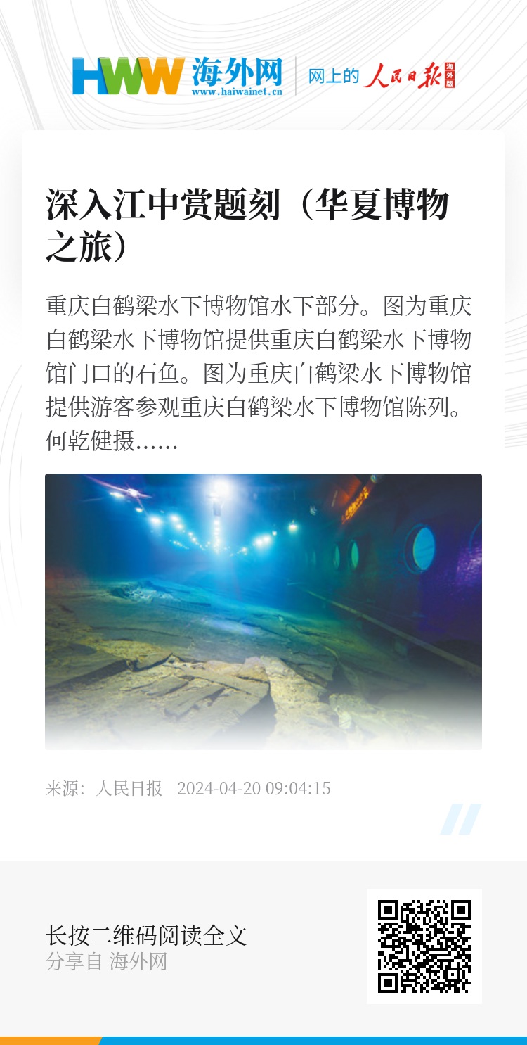 穿过重庆白鹤梁水下博物馆水下廊道,透过玻璃窗,水中石鱼、白鹤、诗句等题刻历经千年依然清晰可见。石缝间不时还会游出一条小鱼,一幅动静结合、生动和谐的图景跃然眼前。