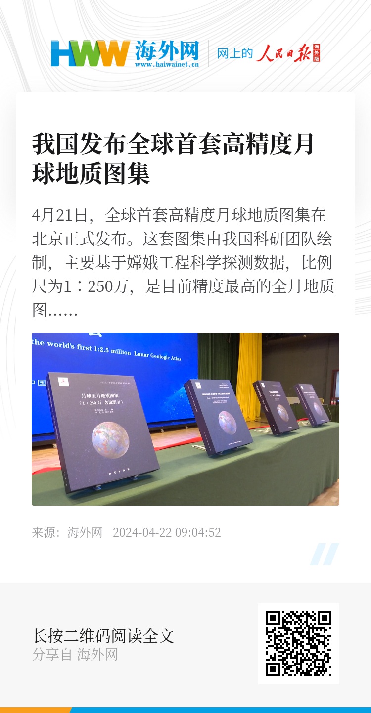 4月21日,全球首套高精度月球地质图集在北京正式发布。这套图集由我国科研团队绘制,主要基于嫦娥工程科学探测数据,比例尺为1∶250万,是目前精度最高的全月地质图集。图源:视觉中国