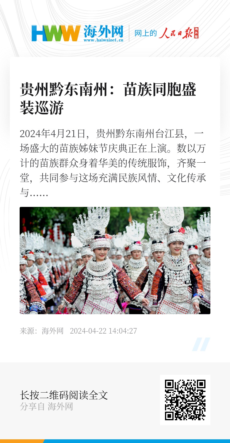 2024年4月21日,贵州黔东南州台江县,一场盛大的苗族姊妹节庆典正在上演。数以万计的苗族群众身着华美的传统服饰,齐聚一堂,共同参与这场充满民族风情、文化传承与旅游观光元素的活动。图源:视觉中国