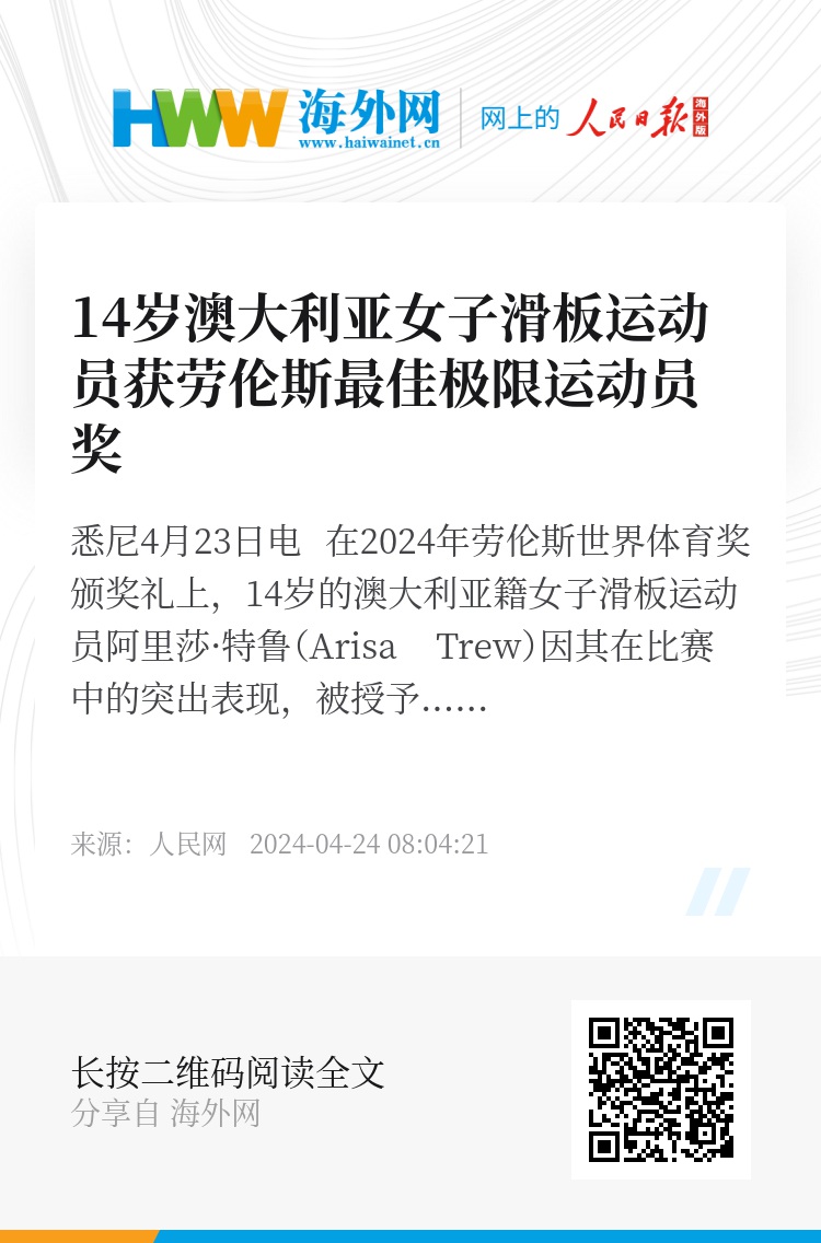 人民网悉尼4月23日电 在2024年劳伦斯世界体育奖颁奖礼上,14岁的澳大利亚籍女子滑板运动员阿里莎·特鲁(Arisa Trew)因其在比赛中的突出表现,被授予年度最佳极限运动员奖项。该颁奖典礼于4月22日在西班牙马德里举行,吸引了全球体坛的目光。