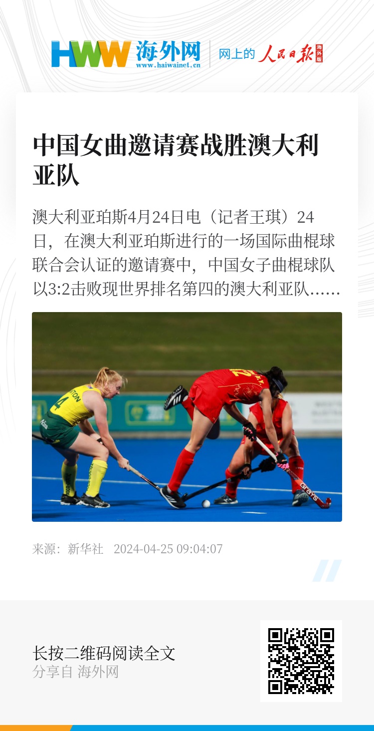 新华社澳大利亚珀斯4月24日电(记者王琪)24日,在澳大利亚珀斯进行的一场国际曲棍球联合会认证的邀请赛中,中国女子曲棍球队以3:2击败现世界排名第四的澳大利亚队。